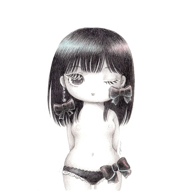「おぎょうぎわるいこ」 2017年、鉛筆作品。 特殊紙にオフセット印刷。 裏面にも薄く印刷有り。
